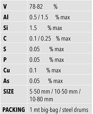 Ferro Vanadium is a universal hardener, strengthener and anti-corrosive additive for steels like high-strength low-alloy HSLA steel, tool steels, as well as other ferrous-based products.